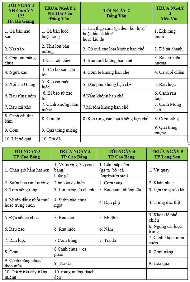 - 08 bữa theo chương trình (Món ăn đặc sản địa phương).